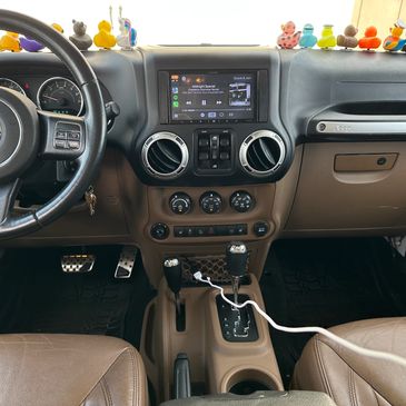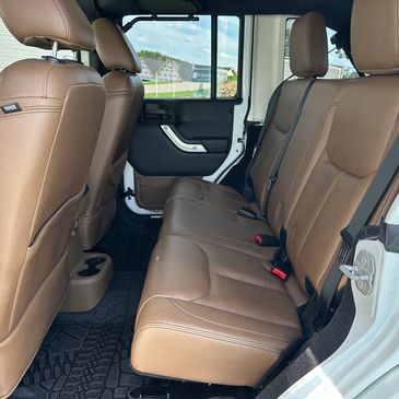 Cleanup made easy with durable leather and custom heavy duty rubber mats throughout the Jeep.